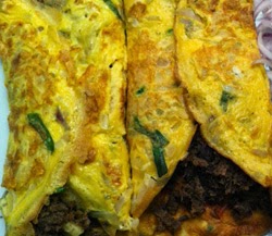Omletas su mėsos įdaru. Kiaušinius, druską ir miltus gerai išsukti. Galiausiai supilti pieną ir sukti iki vienalytės masės.