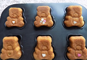 Naminiai meškiukai Barniai. Į kefyrą berti sodą išmaišyti, pilti tirpintą sviestą, berti cukrų, druską, dėti citrinos žievelę, išmaišyti, įmušti kiaušinius išmaišyti, berti miltus išmaišyti iki vientisos masės, dėti į formeles kepti įkaitintoje orkaitėje iki 180 laipsnių 15-20 min.